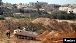 Xe bọc thép được các trực thăng tấn công vũ trang yễm trợ được sử dụng trong một cuộc ruồng bố các nghi can chủ chiến ẩn náu chung quanh thị trấn Sheikh Zuweid gần biên giới dải Gaza của Palestine.