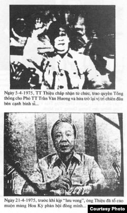 Ngày 26 tháng 4 năm 1975, nghĩa là năm ngày sau khi Tổng thống Thiệu từ chức, Quốc hội Sài Gòn thông báo người được Tổng Thống Thiệu chỉ định thay thế ông (theo Hiến Pháp VNCH) là Phó Tổng thống Trần Văn Hương, nay được Quốc Hội ủy nhiệm quyền tuyển chọn một người thay thế ông trong chức vụ Tổng thống VNCH. Trên cơ sở thông báo này, quyền Tổng thống Trần Văn Hương đã chỉ định Đại tướng Dương Văn Minh làm Tổng thống VNCH (ngòai dự liệu của Hiến pháp VNCH). Ngày 28-4-1975, Tướng Minh nhậm chức, cử Giáo sư Vũ Văn Mẫu làm Thủ tướng, đứng ra thành lập chính phủ hòa giải, thay thế chính phủ chống cộng cuối cùng của ông Nguyễn Bá Cẩn mới được thành lập trước đó một tuần.
