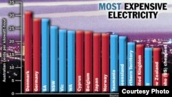 Tiền điện các gia đình Úc trả hàng tháng trong năm 2011 cao hơn hẳn ở Nhật, Cộng đồng Âu châu, Mỹ và Canada. Ở Úc, giá điện mỗi tiểu bang mỗi khác. Ở tiểu bang Nam Úc, giá mỗi kilowatt điện là 28.6 cents, mắc hàng thứ ba trên thế giới, chỉ sau Đan Mạch (31.4 cents) và Đức (28.7 cents). Đứng ngay sau Nam Úc là các tiểu bang New South Wales (thứ 4), Victoria (thứ 5) và Tây Úc (thứ 6):
