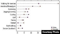Theo một cuộc điều tra được thực hiện trong hai năm 2009-2010, 64% người Úc từ 15 tuổi trở lên tham gia một sinh hoạt thể thao nào đó ít nhất là một lần một năm. Gần một nửa số người ấy (tức khoảng 30% toàn bộ số người trên 15 tuổi) tham gia khá thường xuyên (hơn hai lần một tuần). Các hình thức thể thao phổ biến nhất là: đi bộ (23%), tập thể dục dụng cụ (14%), bơi (7.4%), chạy bộ (6.5%), đạp xe, chơi golf, đánh tennis, đi bộ trong rừng, chơi bóng đá (soccer).