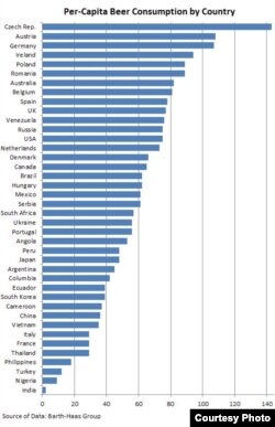 Về uống, tôi chỉ xin tập trung vào một điểm: uống bia. Ở Úc, rượu vang cũng rất ngon và càng ngày càng có tiếng trên thế giới. Nhưng thức uống tiêu biểu nhất của Úc hẳn là bia. Về mức độ tiêu thụ bia của người Úc so với thế giới, trong các tài liệu tôi đọc được, có nhiều cách xếp hạng khác nhau. Nhưng hầu như lúc nào Úc cũng là một trong “top ten”, mười nước đứng đầu. Bảng xếp hạng dưới đây là một ví dụ: Úc đứng thứ 7 (trong khi Việt Nam ở hạng 33).