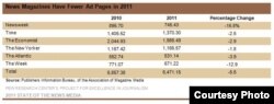 Bảng dưới đây cho thấy sự sút giảm cụ thể hơn của từng tờ báo lớn từ năm 2010 đến 2011, trong đó, Newsweek bị sút giảm trầm trọng nhất:
