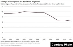 Không những giảm số báo bán được, theo Katerina-Eva Matsa, Jane Sasseen và Amy Mitchell trong bài “Magazines: by the numbers”, số lượng quảng cáo trên các báo từ năm 2001 đến nay cũng giảm: