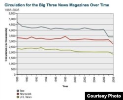 Trong bài “A note on Newsweek (long) (updated)” đăng trên The Atlantic, James Fallows ghi nhận số ấn bản của cả ba tờ báo lớn nhất ở Mỹ - Time, Newsweek và U.S. News - đều bị giảm liên tục từ 1988 đến 2008.