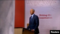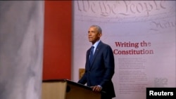 Cựu Tổng thống Obama đang phát biểu từ Viện Bảo tàng Cách mạng Mỹ ở thành phố Philadelphia, với phông nền là Hiến pháp Hoa Kỳ.