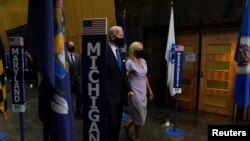 Ứng cử viên tổng thống Joe Biden cùng phu nhân Jill đeo khẩu trang rời hội trường sau khi kết thúc bài diễn văn nhận đề cử tổng thống của Đảng Dân chủ.