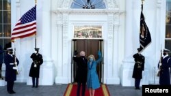 Tổng thống thứ 46 và đệ nhất phu nhân Jill Biden đi ngang qua một hàng binh danh dự, với cờ của các bang của Mỹ, dẫn đến lối vào chính dưới Cổng Hiên Bắc (North Portico).