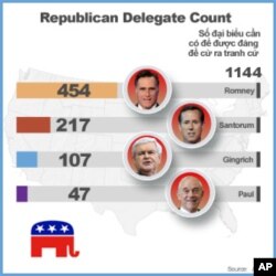 Ông Romney, cựu thống đốc bang Massachusetts, đang dẫn đầu rất xa về số đại biểu, với gần 40% trong tổng số 1.144 đại biểu cần có để bảo đảm được đảng đề cử ra tranh cử tổng thống.