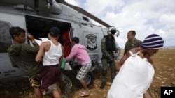 Hôm thứ Sáu, máy bay trực thăng trên hàng không mẫu hạm Mỹ USS George Washington đã bắt đầu chở lương thực, nước uống và thuốc men tới những ngôi làng hẻo lánh.