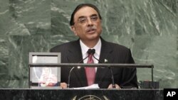 Phát biểu trước Đại hội đồng Liên Hiệp Quốc ngày hôm qua, Tổng thống Pakistan Asif Ali Zardari nói an toàn và an ninh là những mối quan tâm hàng đầu đối với chính quyền của ông. Trong những năm qua, hàng chục ngàn người đã thiệt mạng vì khủng bố ở Pakistan, trong đó có cả vợ của ông, cựu Thủ tướng Benazir Bhutto. Hình ảnh được để trên bục diễn thuyết khi ông Zardari phát biểu.