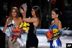 Cô Wurtzbach sững sờ khi cô bước ra trước sân khấu cạnh cô Arevalo đang đội vương miện, trước khi Hoa hậu Hoàn vũ năm ngoái đến từ Colombia tháo vương miện và đặt lên đầu cô Wurtzbach.