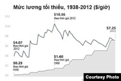 Theo thống kê của Bộ Lao Động Hoa Kỳ, mức lương tối thiểu liên bang theo giờ ở Mỹ đã tăng từ $0.25 vào năm 1938, lên đến $1.60 vào năm 1968, và từ 2009 đến nay là $7.25. Nếu tính theo giá cố định của năm 2012 để loại trừ ảnh hưởng của lạm phát, mức lương tối thiểu của ba năm 1938, 1968, và 2012 sẽ lần lượt là $4.07, $10.56, và $7.25. Do đó mức lương tối thiểu hiện nay thấp hơn cả mức lương của 1968.