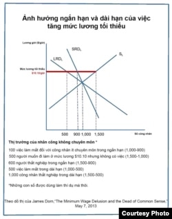 Lương bổng là giá định đoạt bởi thị trường cũng như gạo hay than. Một số không ít kinh tế gia nhận định rằng tăng mức lương tối thiểu là phản lại luật cung cầu trong một hệ thống kinh tế tự do. Tăng mức lương tối thiểu bằng luật pháp là tăng giá nhân công một cách giả tạo. Làm như thế là giảm số việc làm và hậu quả là nạn thất nghiệp tăng. Khi giá nhân công tăng, chủ nhân thường có khuynh hướng giảm số nhân công xuống và trong dài hạn mức cầu giảm nhiều hơn ngắn hạn vì chủ nhân tìm những phương pháp sản xuất tiết kiệm nhân công.