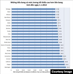 Tính đến ngày 1/1/2014, 19 tiểu bang có mức lương tối thiểu cao hơn mức lương tối thiểu của liên bang. Trong số này Michigan có mức lương tối thiểu thấp nhất là $7.40 và Washington có mức lương tối thiểu cao nhất là $9.32. California sẽ có mức lương tối thiểu là $9.00 vào tháng 7, 2014. [3] Delaware vào cuối tháng 1 vừa qua cũng đã thông qua một đạo luật để tăng mức lương tối thiểu từ $7.25 lên đến $7.75 vào 1-6-2014 và $8.25 vào 1-6-2015. District of Columbia vào năm ngoái quyết định tăng mức tối thiểu từ $8.25 lên $11.50 trước 2016. Thành phố SeaTac của tiểu bang Washington vào cuối năm 2013 đã chấp thuận nâng mức lương tối thiểu từ $9.19 (áp dụng cho toàn tiểu bang) lên $15. Mức lương mới đã bắt dầu có hiệu lực vào ngày 1-1-2014. Tuy nhiên nhiều cơ sở thương mại nhỏ được miễn trả lương tối thiểu mới này.