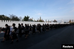 Tại tỉnh Nonthaburi, phía bắc Bangkok, một dòng người mặc trang phục đen dài dằng dặc đứng chờ đợi để được đặt hoa kính viếng cố Quốc vương, trong khi các tình nguyện viên đưa thức ăn cho họ, theo tường thuật của Reuters.