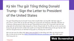 Người Việt ở trong nước và ở hải ngoại đang tham gia ký tên vào bức thư do Quỹ Nghiên cứu Biển Đông và Nhóm Biển Đông tại Pháp soạn thảo để gửi cho Tổng thống Hoa Kỳ Donald Trump nhân dịp thượng đỉnh Trump-Kim sắp tới ở Hà Nội.