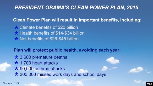Gọi Kế hoạch Điện năng Sạch là "bước quan trọng duy nhất mà nước Mỹ từng thực hiện trong cuộc chiến chống lại biến đổi khí hậu toàn cầu," ông Obama nhấn mạnh những nhà máy điện chịu trách nhiệm về một phần ba lượng ô nhiễm carbon của đất nước, nhiều hơn xe hơi, nhà ở và máy bay cộng lại.