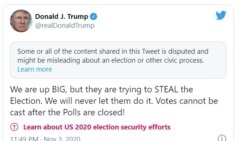 Tổng Thống Trump tải lên dòng tweet của ông sau khi ứng cử viên Đảng Dân Chủ nói hiện còn quá sớm để biết kết quả tại các bang chiến trường. Ông Biden kêu gọi các ủng hộ viên hãy kiên nhẫn chờ đợi kiểm tất cả các phiếu còn lại.