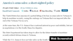 Bộ Ngoại giao Mỹ hồi đầu tháng này loan báo dỡ bỏ một phần lệnh cấm bán võ khí cho Việt Nam kéo dài hàng chục năm nay. Động thái này là một phần trong chiến lược rộng lớn hơn của Mỹ nhằm giúp các nước trong khu vực Biển Đông tăng cường khả năng an ninh hàng hải của mình.